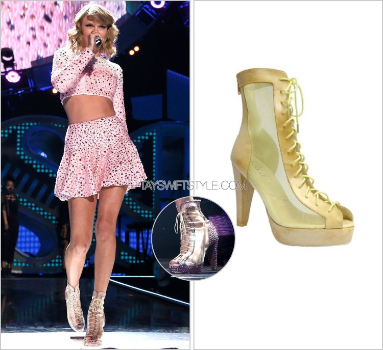 Taylor’s interesting lace-up platform peep toe boots she first debuted during her iHeartRadio performance (during rehearsals she wore a black version), are custom pink crystal-covered versions of these boots by shoe dancewear provider Kelaci.