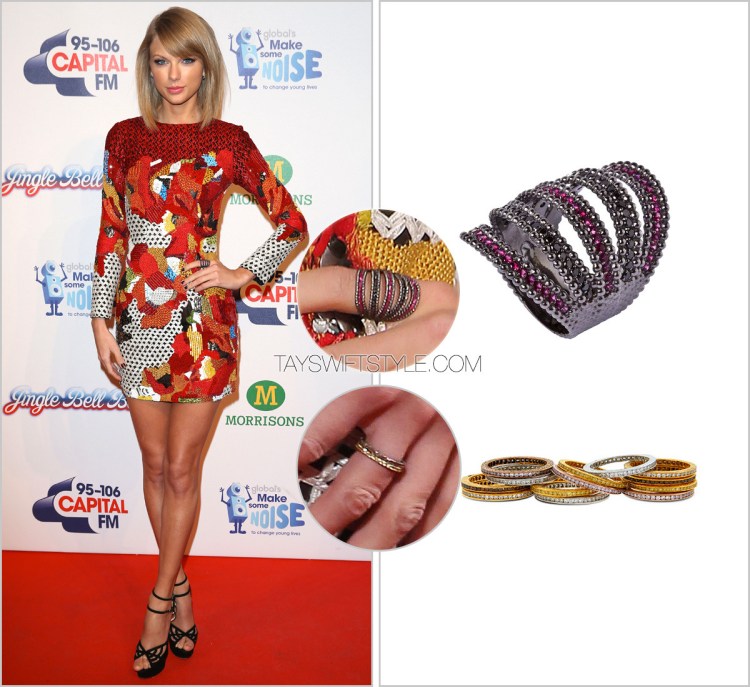 Rather than relying on her usual go-to jeweller Lorraine Schwartz, Taylor piled on several rings by a handful of jewelry brands. My favourite would be her second Bavna ring (stock photo not pictured) that she wore on the middle finger of her left hand.
