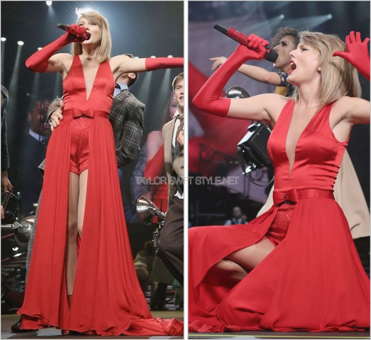 Taylor’s tour costume designer once again shows her fashion prowess by integrating the black widow lace sleeves from the previous number “I Knew You Were Trouble.” and creating a dramatic evening gown by adding on gathered and bustled black skirting.