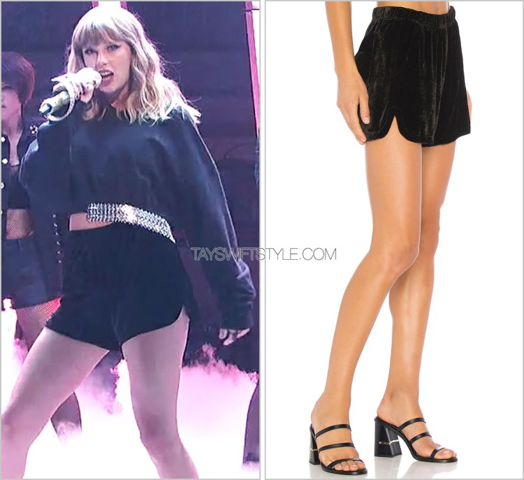 Combining textures and fabrics, Taylor’s metallic hem sweatshirt was tempered by a pair of velvet running-style shorts.