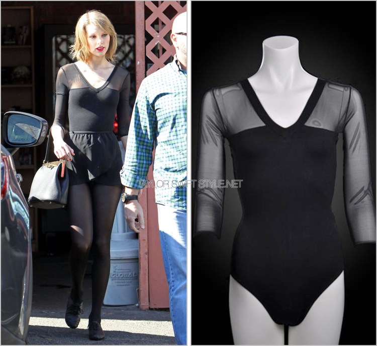 Taylor ventures even further into dancewear apparel in this super chic, mesh sleeve leotard.
