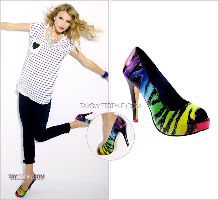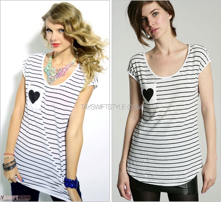 Cute studded sandals by Miss Selfridge dress up Taylor’s otherwise casual outfit here which includes a relaxed tee from Urban Outfitters and frayed, cuffed jeans plus a cute ‘Love’ rosette both by TopShop.