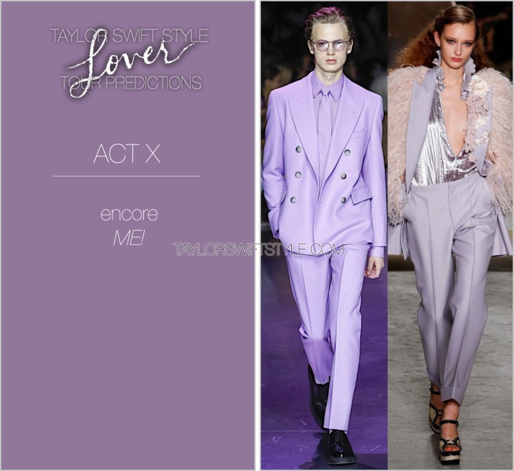 Taylor has historically saved the lead single of the era as her final performance/encore moment. And it was also my last opportunity to throw in another suit into the costume mix. I couldn’t decide between these two purple pastel suits, one is a little bit closer in vibe to the lemon yellow Victoria Hayes suit and tie look from the “ME!” music video itself … but I couldn’t deny the ostentatious embellishment and feathers of the Philosophy Di Lorenzo Serafini runway. So here we have both!