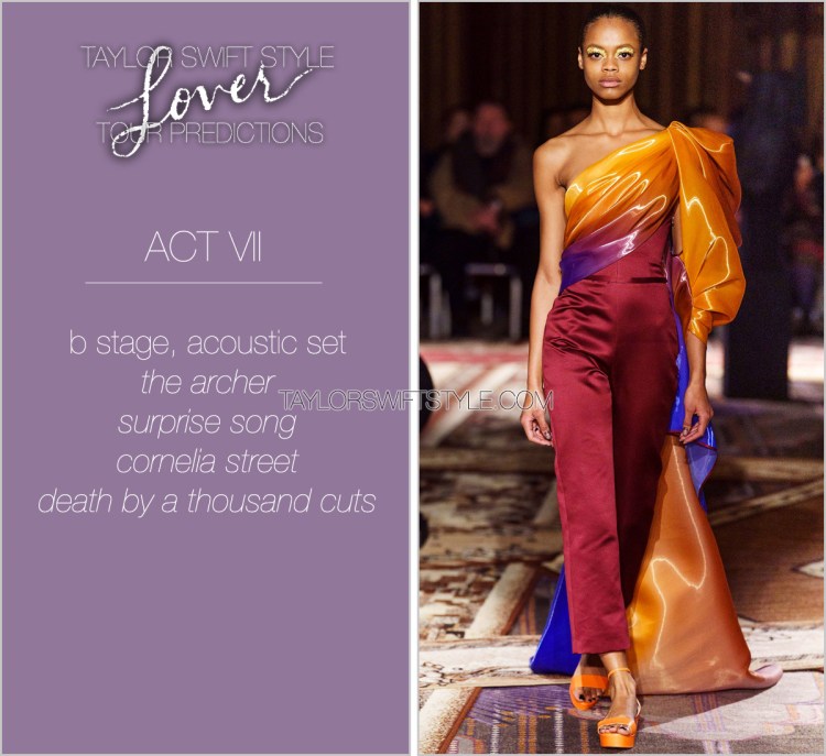 Ugh. Truly … take my breath away. This jumpsuit is another beautifully structured bold but feminine piece that combines. It would be stunning under stage lights, it’s achingly fashun, and it looks like the colours of a sunset. If you’ll notice, I carefully crafted most of the tour’s costume choices to be centered on pinks and purples in order to flow and be consistent. But this … this is just so special. And beautiful. And memorable. I demand strappy heels only to be worn for this.