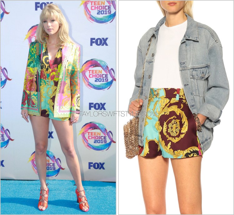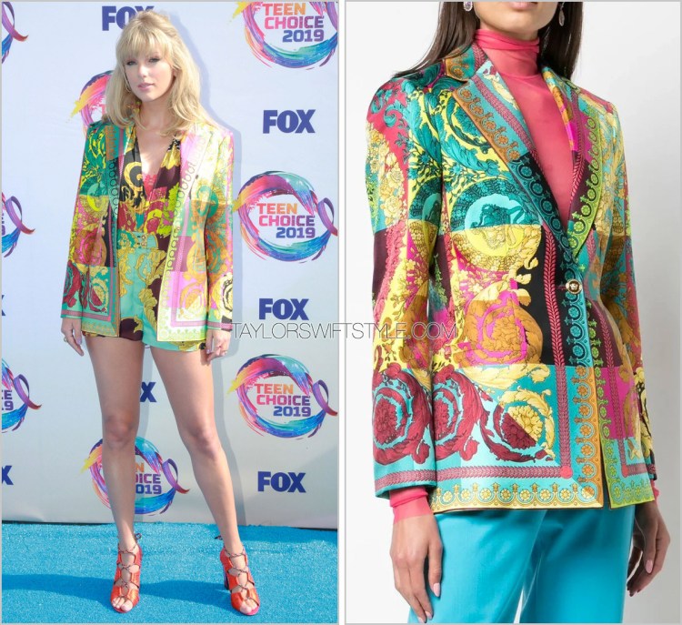 How much fun and unexpected is this? While it isn’t the Chanel suit that I predicted, I’ll take a partial win on this suiting moment from Versace. I’ll also take points for short. And that’s where my predictions accuracy stopped. Where I thought Taylor would go light, fluffy, and pastel she veered hard into an overboard of patterns.