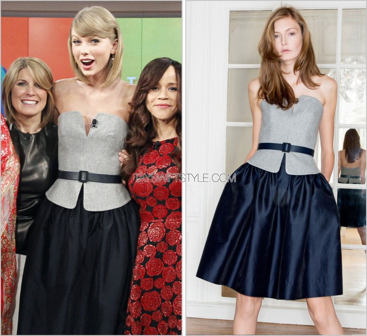 Taylor wore a look straight from Martin Grant’s Fall 2014 collection consisting of a belted strapless grey bustier with slits at both the neck and hem. Contrasted by a fuller black skirt.
