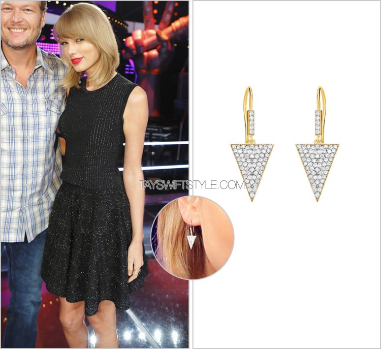 Taylor’s triangle drop earrings she wore on The Voice are by Red C Jewels, who she’s turned to on multiple occasions for her latest rounds of promo.