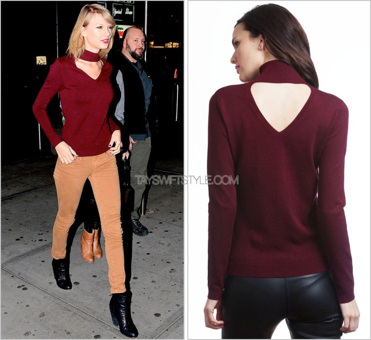 Taylor wears a 525 America sweater while leaving her apartment last night — en route to a Knicks game! Her bordeaux sweater here is actually a reversible piece with Taylor opting to wear the neck cut out side for the front and the high-neck turtleneck to the back.