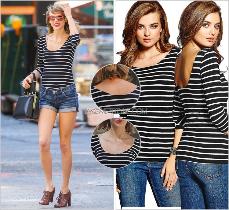 Taylor wears a 525 America sweater while leaving her apartment last night — en route to a Knicks game! Her bordeaux sweater here is actually a reversible piece with Taylor opting to wear the neck cut out side for the front and the high-neck turtleneck to the back.