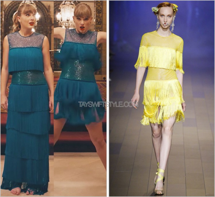 Fringe, a bit of sparkle, and a tearaway surprise outfit change — all things Taylor loves. While I love the lemon yellow colour presented on the Spring 2018 runway, the teal colour is equally stunning on Taylor.