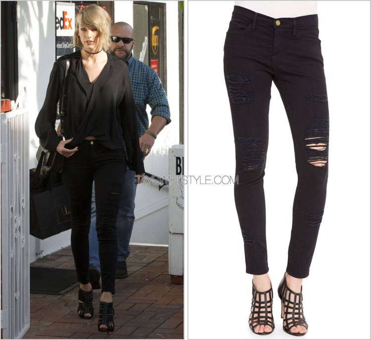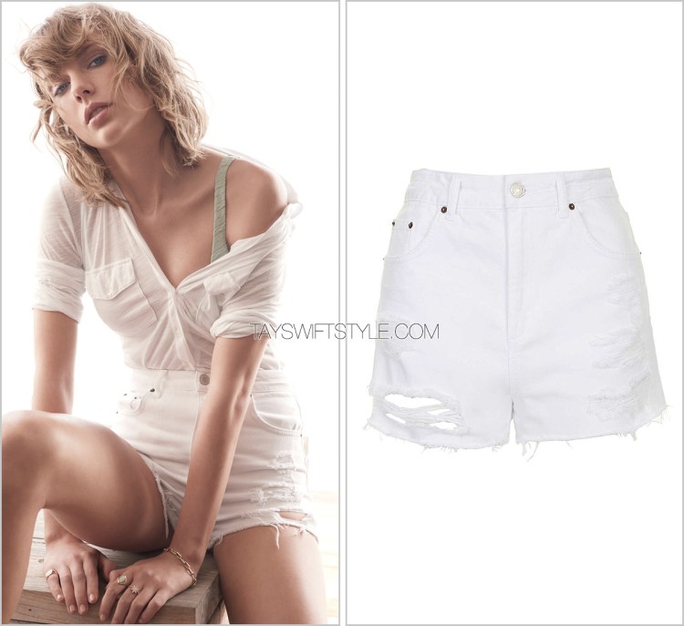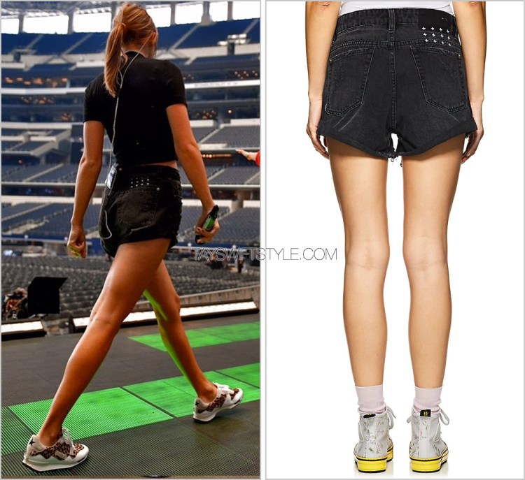 During the rep era is probably when Taylor most consistently wore denim items and didn’t discriminate between types. Jackets, tops, shorts, skirts, and pants were all part of her wardrobe at the time. These particular black distressed shorts by Ksubi were on heavy rotation.