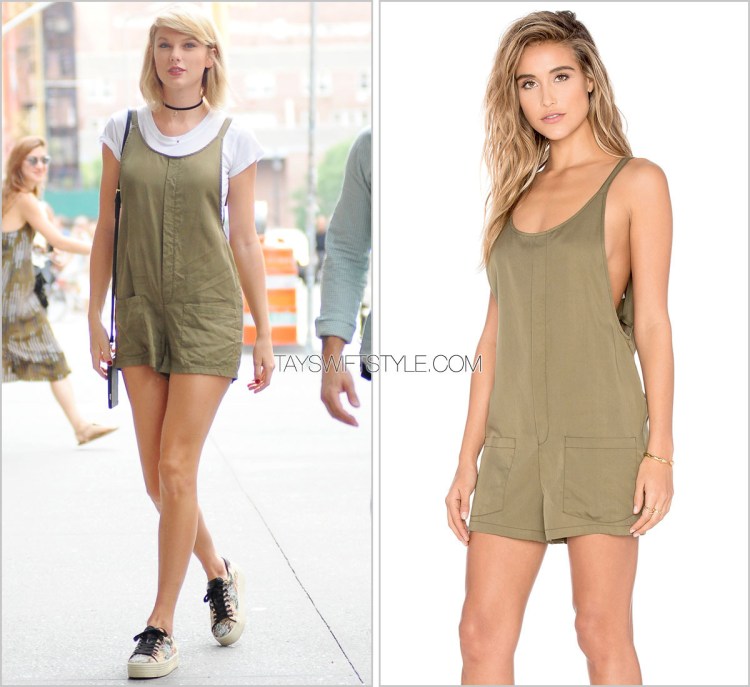 City goth chic, is that a thing? Because if so, Taylor hit the NY streets again wearing an olive romper that in the original lookbook was a bit more revealing than her more fun, casual, and sporty styling.