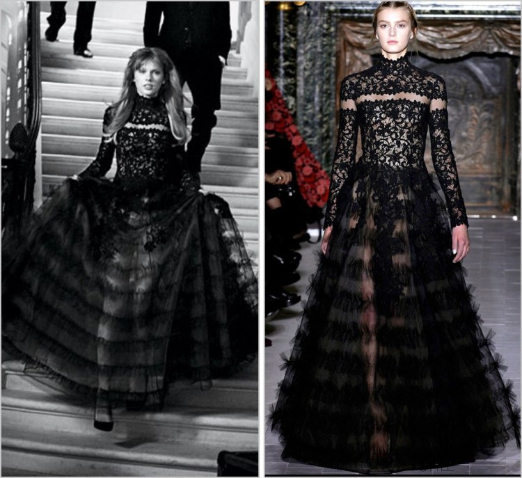 Running noir. After wearing two other Valentino dresses from their RTW lines (one from this same Vanity Fair spread and one for InStyle U.K.), Taylor stuns in this couture lace creation from the Spring collection.