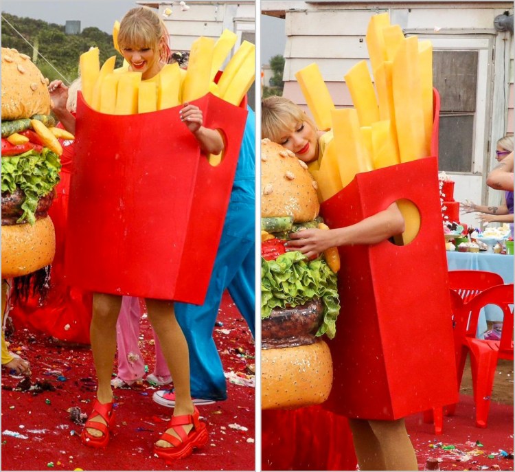 While I had imagined that Taylor’s fries costume would have been created by Moschino, the creator behind the burger look that Katy Perry had originally debuted at this year’s Met Gala, it was actually crafted by Taylor’s own stylist and long-time costume designer Jessica Jones.